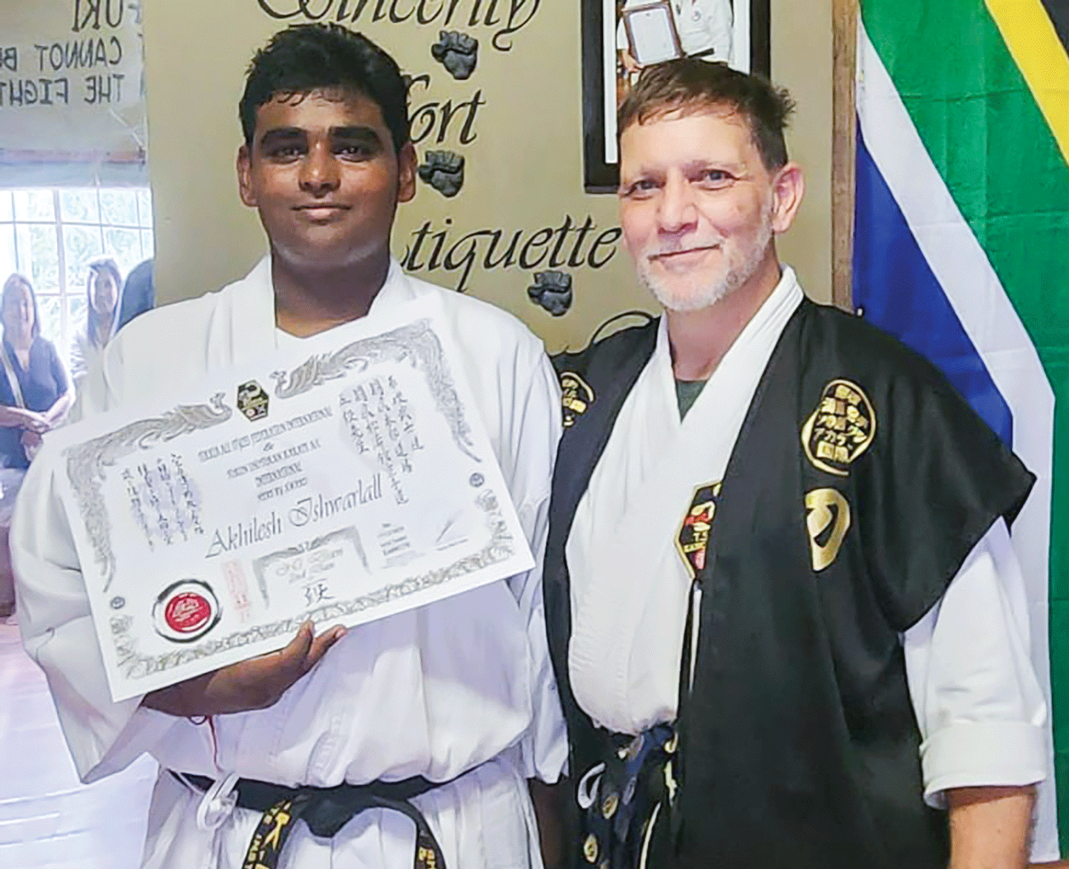 Main photo: Sensei Naeelah Jardien celebrated her successful grading to 1st Dan (Shodan) at the TSKKIA Honbu Dojo in Rustenburg, proudly pictured with kancho Pieter Albert Venter.